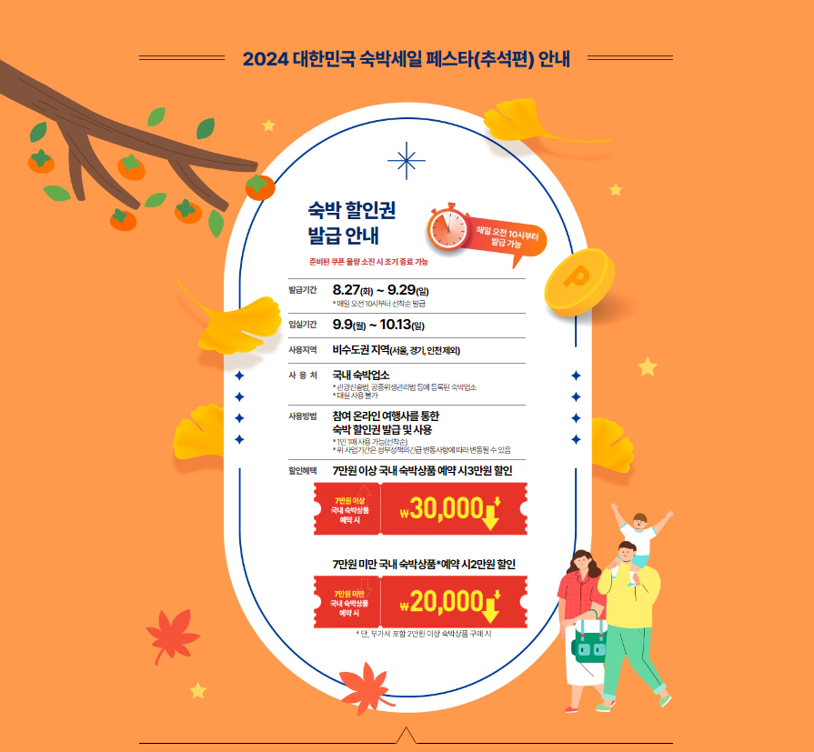 숙박 세일 페스타를 통해 숙박 쿠폰 지급 받으셔서 선선한 가을 사랑하는 사람과 함께 즐거운 여행 다녀오세요!